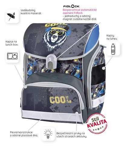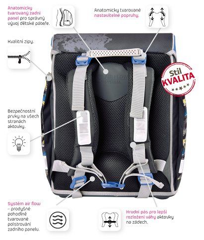 Školní aktovka pro prvňáčka (VHODNÁ PRO 1. 3. TŘÍDU). Kvalitní, ergonomicky tvarovaná odlehčená školní aktovka je vybavena reflexními prvky a anatomicky tvarovanými zády s pevnou konstrukcí. Školní aktovky Stil jsou ověřeny odborníky. PARAMETRY školní aktovky: Rozměr: výška 38 cm, šířka 32 cm, hloubka 22 cm. Hmotnost: 1 kg. Nosnost: 7 kg. Objem: 17 l. VLASTNOSTI školní aktovky. 3D ZÁDOVÝ SYSTÉM. Aktovka perfektně sedí na zádech. Anatomický zádový panel se přizpůsobí páteři dítěte a systém Air Flow a prodyšné polstrování umožní cirkulaci vzduchu a příjemné nošení. Hrudní pás s kvalitní přezkou zajistí dobré usazení aktovky na zádech dítěte. FIDLOCK: moderní patentové zapínání s magnetem pro snadné otevírání a zavírání aktovky jednou rukou. Velmi praktické a jednoduché řešení pro školáky - při přiložení víka se samo zapne. BEZPEČNOST: bezpečnostní prvky jsou velmi důležité, proto je aktovka vybavena reflexní pásky na všech stranách batohu, které zaručí lepší viditelnost a bezpečnost dítěte ve tmě. VNITŘNÍ USPOŘÁDÁNÍ: Hlavní vnitřní komora je rozdělená látkovou přepážkou pro lepší uložení pomůcek. V přední části komory je kapsička pro uložení drobností. Přední kapsa aktovky je určena pro svačinový box nebo penál.