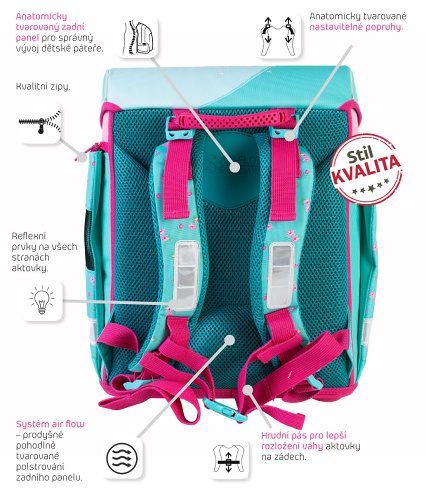 Kvalitní, ergonomická a velmi odolná školní aktovka je vybavena reflexními prvky a anatomicky tvarovanými zády s pevnou konstrukcí.