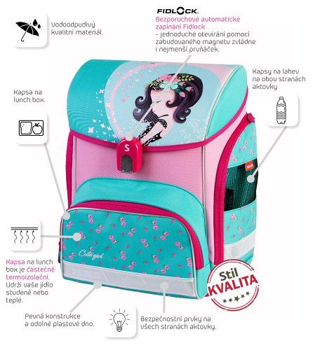 FIDLOCK - moderní patentové zapínání s magnetem pro snadné otevírání a zavírání aktovky jednou rukou. Velmi praktické a jednoduché řešení i pro nejmenší prvňáčky - při přiložení víka se samo zapne.