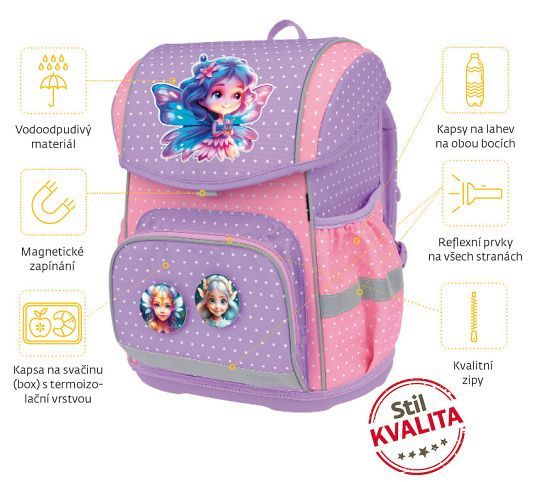 - Po obou stranách batohu se nalézají kapsy na deštník nebo lahev s pitím. Kapsy svým umístěním a elastickými okraji pomáhají eliminovat riziko rozlití nápoje a poničení obsahu aktovky. Školní aktovky jsou navrženy tak, aby byly nejen praktické, ale i hravé! Letos jsme aktovku obohatili o veselý design s vyměnitelnými aplikacemi s obrázky víl, které dětem umožní přizpůsobit si aktovku podle jejich nálady nebo stylu. Každý den tak může být jiný, zábavný a plný barev!