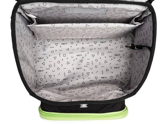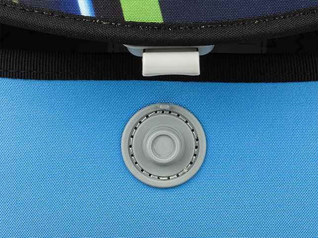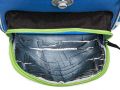 - VNITŘNÍ USPOŘÁDÁNÍ – prostorná hlavní vnitřní komora je rozdělená látkovou přepážkou pro uložení boxu na sešity či knih. Součástí hlavní komory je také kapsička pro uložení drobností, odepínatelný kroužek na klíč a štítek na jméno a adresu. Ve víku je průhledná kapsička na rozvrh hodin