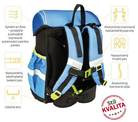 - POHODLÍ – výškově nastavitelný hrudní a nově i odnímatelný bederní pás s kvalitní přezkou zajistí pohodlné usazení aktovky na zádech dítěte i správné rozložení váhy