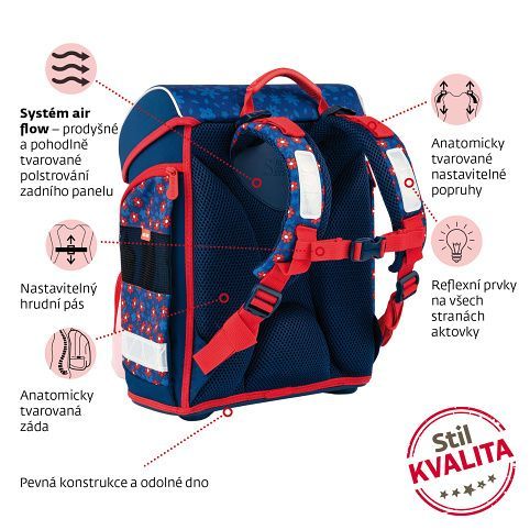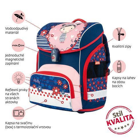 Kvalitní, ergonomická a velmi odolná školní aktovka je vybavena reflexními prvky a anatomicky tvarovanými zády s pevnou konstrukcí. FIDLOCK - moderní patentové zapínání s magnetem pro snadné otevírání a zavírání aktovky jednou rukou. Vodoodpudivý materiál,reflexní prvky,kapsa na luch box.