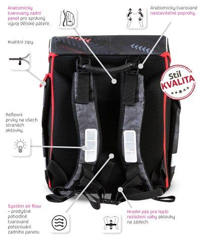 Školní aktovka pro prvňáčka (VHODNÁ PRO 1. 3. TŘÍDU). Kvalitní, ergonomicky tvarovaná odlehčená školní aktovka je vybavena reflexními prvky a anatomicky tvarovanými zády s pevnou konstrukcí. Školní aktovky Stil jsou ověřeny odborníky. PARAMETRY školní aktovky: Rozměr: výška 38 cm, šířka 32 cm, hloubka 22 cm. Hmotnost: 1 kg. Nosnost: 7 kg. Objem: 17 l. VLASTNOSTI školní aktovky. 3D ZÁDOVÝ SYSTÉM. Aktovka perfektně sedí na zádech. Anatomický zádový panel se přizpůsobí páteři dítěte a systém Air Flow a prodyšné polstrování umožní cirkulaci vzduchu a příjemné nošení. Hrudní pás s kvalitní přezkou zajistí dobré usazení aktovky na zádech dítěte. FIDLOCK: moderní patentové zapínání s magnetem pro snadné otevírání a zavírání aktovky jednou rukou. Velmi praktické a jednoduché řešení pro školáky - při přiložení víka se samo zapne. BEZPEČNOST: bezpečnostní prvky jsou velmi důležité, proto je aktovka vybavena reflexní pásky na všech stranách batohu, které zaručí lepší viditelnost a bezpečnost dítěte ve tmě. VNITŘNÍ USPOŘÁDÁNÍ: Hlavní vnitřní komora je rozdělená látkovou přepážkou pro lepší uložení pomůcek. V přední části komory je kapsička pro uložení drobností. Přední kapsa aktovky je určena pro svačinový box nebo penál.