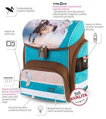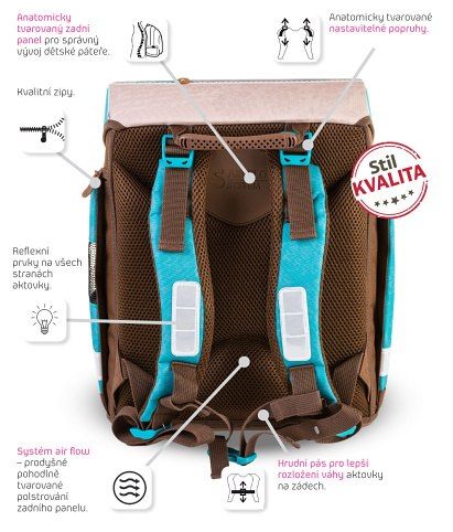 Školní aktovka pro prvňáčka (VHODNÁ PRO 1. 3. TŘÍDU). Kvalitní, ergonomicky tvarovaná odlehčená školní aktovka je vybavena reflexními prvky a anatomicky tvarovanými zády s pevnou konstrukcí. Školní aktovky Stil jsou ověřeny odborníky. PARAMETRY školní aktovky: Rozměr: výška 38 cm, šířka 32 cm, hloubka 22 cm. Hmotnost: 1 kg. Nosnost: 7 kg. Objem: 17 l. VLASTNOSTI školní aktovky. 3D ZÁDOVÝ SYSTÉM. Aktovka perfektně sedí na zádech. Anatomický zádový panel se přizpůsobí páteři dítěte a systém Air Flow a prodyšné polstrování umožní cirkulaci vzduchu a příjemné nošení. Hrudní pás s kvalitní přezkou zajistí dobré usazení aktovky na zádech dítěte. FIDLOCK: moderní patentové zapínání s magnetem pro snadné otevírání a zavírání aktovky jednou rukou. Velmi praktické a jednoduché řešení pro školáky - při přiložení víka se samo zapne. BEZPEČNOST: bezpečnostní prvky jsou velmi důležité, proto je aktovka vybavena reflexní pásky na všech stranách batohu, které zaručí lepší viditelnost a bezpečnost dítěte ve tmě. VNITŘNÍ USPOŘÁDÁNÍ: Hlavní vnitřní komora je rozdělená látkovou přepážkou pro lepší uložení pomůcek. V přední části komory je kapsička pro uložení drobností. Přední kapsa aktovky je určena pro svačinový box nebo penál.