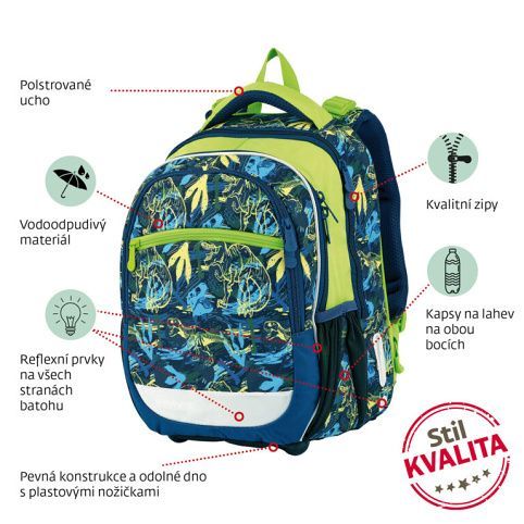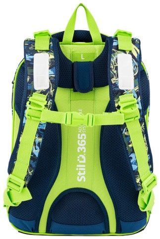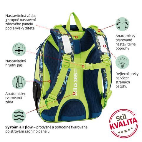 Školní batoh VHODNÝ PRO 1 - 4. třídu. Kvalitní, ergonomicky tvarovaný odlehčený školní batoh je vybaven reflexními prvky a anatomicky tvarovanými zády s pevnou konstrukcí. Školní batohy Stil jsou ověřeny odborníky. Parametry školního batohu: Rozměr: výška 40 cm, šířka 30 cm, hloubka 20 cm. Hmotnost: 0,9 kg. Nosnost: 7 kg. Objem: 20 l. Vlastnosti školního batohu: STIL ADJUSTABLE SYSTÉM: nastavitelný systém zad se třemii stupněmi pro optimální usazení batohu na zádech podle výšky a věku dítěte. Batoh, který roste s dítětem. 3D ZÁDOVÝ SYSTÉM: batoh perfektně sedí na zádech. Anatomický zádový panel se přizpůsobí páteři dítěte a systém Air Flow a prodyšné polstrování umožní cirkulaci vzduchu a příjemné nošení. Hrudní pás s kvalitní přezkou zajistí dobré usazení aktovky na zádech dítěte. BEZPEČNOST: bezpečnostní prvky jsou velmi důležité, proto je aktovka vybavena reflexními pásky na všech stranách batohu, které zaručí lepší viditelnost a bezpečnost dítěte ve tmě. VNITŘNÍ USPOŘÁDÁNÍ: Skládá se ze 3 prostorných komor opatřených pevnými zipy a přední kapsy pro uložení drobných předmětů. Pevná kontrukce a voděodolné dno s plastovými nožičkami. AIR FLOW: prodyšné pohodlně tvarované polstrování zadního panelu. Anatomicky tvarované nastavitelné popruhy pro pohodlné nošení. Hrudní pás pro lepší rozložení váhy školního batohu na zádech.