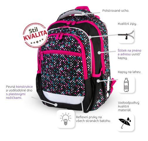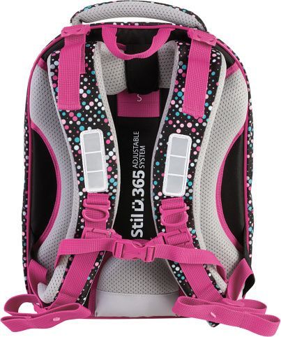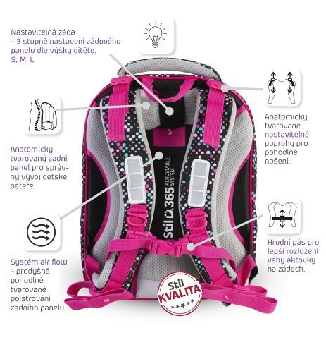 Školní batoh VHODNÝ PRO 1 - 4. třídu. Kvalitní, ergonomicky tvarovaný odlehčený školní batoh je vybaven reflexními prvky a anatomicky tvarovanými zády s pevnou konstrukcí. Školní batohy Stil jsou ověřeny odborníky. Parametry školního batohu: Rozměr: výška 40 cm, šířka 30 cm, hloubka 20 cm. Hmotnost: 0,9 kg. Nosnost: 7 kg. Objem: 20 l. Vlastnosti školního batohu: STIL ADJUSTABLE SYSTÉM: nastavitelný systém zad se třemii stupněmi pro optimální usazení batohu na zádech podle výšky a věku dítěte. Batoh, který roste s dítětem. 3D ZÁDOVÝ SYSTÉM: batoh perfektně sedí na zádech. Anatomický zádový panel se přizpůsobí páteři dítěte a systém Air Flow a prodyšné polstrování umožní cirkulaci vzduchu a příjemné nošení. Hrudní pás s kvalitní přezkou zajistí dobré usazení aktovky na zádech dítěte. BEZPEČNOST: bezpečnostní prvky jsou velmi důležité, proto je aktovka vybavena reflexními pásky na všech stranách batohu, které zaručí lepší viditelnost a bezpečnost dítěte ve tmě. VNITŘNÍ USPOŘÁDÁNÍ: Skládá se ze 3 prostorných komor opatřených pevnými zipy a přední kapsy pro uložení drobných předmětů. Pevná kontrukce a voděodolné dno s plastovými nožičkami. AIR FLOW: prodyšné pohodlně tvarované polstrování zadního panelu. Anatomicky tvarované nastavitelné popruhy pro pohodlné nošení. Hrudní pás pro lepší rozložení váhy školního batohu na zádech.