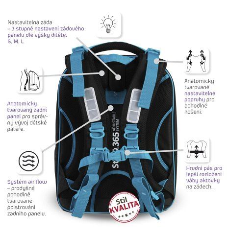 Školní batoh VHODNÝ PRO 1 - 4. třídu. Kvalitní, ergonomicky tvarovaný odlehčený školní batoh je vybaven reflexními prvky a anatomicky tvarovanými zády s pevnou konstrukcí. Školní batohy Stil jsou ověřeny odborníky. Parametry školního batohu: Rozměr: výška 40 cm, šířka 30 cm, hloubka 20 cm. Hmotnost: 0,9 kg. Nosnost: 7 kg. Objem: 20 l. Vlastnosti školního batohu: STIL ADJUSTABLE SYSTÉM: nastavitelný systém zad se třemii stupněmi pro optimální usazení batohu na zádech podle výšky a věku dítěte. Batoh, který roste s dítětem. 3D ZÁDOVÝ SYSTÉM: batoh perfektně sedí na zádech. Anatomický zádový panel se přizpůsobí páteři dítěte a systém Air Flow a prodyšné polstrování umožní cirkulaci vzduchu a příjemné nošení. Hrudní pás s kvalitní přezkou zajistí dobré usazení aktovky na zádech dítěte. BEZPEČNOST: bezpečnostní prvky jsou velmi důležité, proto je aktovka vybavena reflexními pásky na všech stranách batohu, které zaručí lepší viditelnost a bezpečnost dítěte ve tmě. VNITŘNÍ USPOŘÁDÁNÍ: Skládá se ze 3 prostorných komor opatřených pevnými zipy a přední kapsy pro uložení drobných předmětů. Pevná kontrukce a voděodolné dno s plastovými nožičkami. AIR FLOW: prodyšné pohodlně tvarované polstrování zadního panelu. Anatomicky tvarované nastavitelné popruhy pro pohodlné nošení. Hrudní pás pro lepší rozložení váhy školního batohu na zádech.