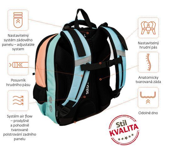 - STIL ADJUSTABLE SYSTEM – nastavitelný systém zad se třemi stupni pro optimální usazení batohu na zádech podle výšky a věku dítěte. Batoh, který roste s dítětem