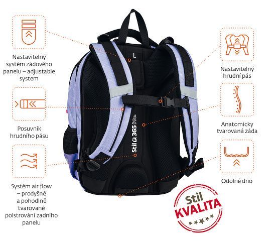 - STIL ADJUSTABLE SYSTEM – nastavitelný systém zad se třemi stupni pro optimální usazení batohu na zádech podle výšky a věku dítěte. Batoh, který roste s dítětem