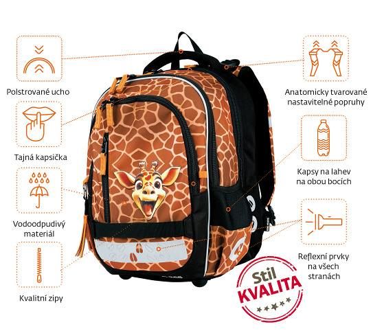 Ergonomický batoh, který roste s dítětem (Adjustable system) 3D anatomický zádový panel Systém Air Flow a prodyšné polstrování 3 prostorné komory a přední kapsy Anatomicky tvarované nastavitelné popruhy Vodoodpudivý materiál Odolné dno s plastovými nožičkami Reflexní pásky Hrudní pás Nově navíc skrytá kapsička na cennosti pod horním madlem, nový vylepšený nastavitelný posuvník hrudního pásu, nový popruh na přední straně pro uchycení např. mikiny cestou domů ze školy Rozměry: výška 40 cm, šířka 30 cm, hloubka 20 cm Hmotnost: cca 1 kg Nosnost: 7 kg Objem: 20 l