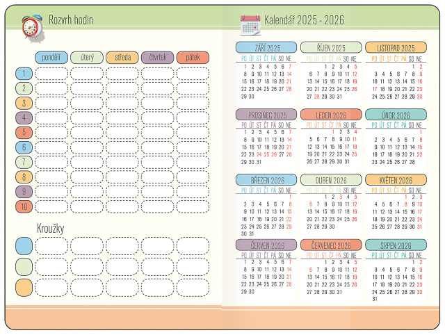 Studentský diář 100 x 150 mm na školní rok 2025/2026. Obsahuje české kalendárium rozvrh hodin, adresář, přehled prázdnin a užitečné informace z předmětů - matematika, chemie, fyzika, český jazyk.