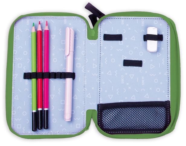 Dvoupatrové penály obsahují v prvním patře 8 gumiček na pastelky a tužky, dále gumičky na ořezávátko, gumu či nůžky a nyní nově síťovanou kapsičku s pružným lemem pro uložení drobností. Ve druhém patře penálu je umístěna průhledná kapsička na rozvrh a tajné dokumenty a 9 pevných gumiček na psací potřeby. Dokonale barevně sladěný design s aktovkou či batohem je samozřejmostí.