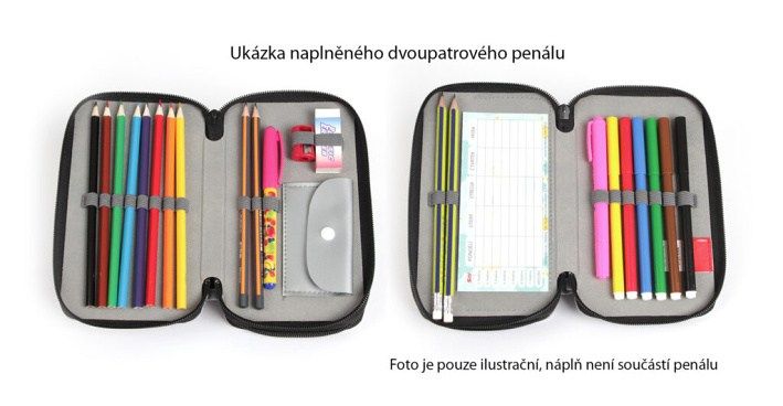 Dvoupatrové penály obsahují v prvním patře 8 gumiček na pastelky, 2 gumičky na tužky a jednu větší na pero, dále gumičky na ořezávátko a gumu a kapsičku na drobnosti, uzavíratelnou na patent. Ve druhém patře penálu je umístěna průhledná kapsička na rozvrh a tajné dokumenty a 9 pevných gumiček na psací potřeby různých velikostí. Dokonale barevně sladěný design s aktovkou či batohem je samozřejmostí.