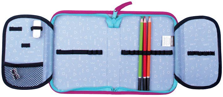 Jednopatrové penály mají velkou kapacitu k umístění psacích potřeb. 24 pevných gumiček různých velikostí slouží k pohodlnému uložení pastelek, psacího pera, tužek, pravítka, ořezávátka a gumy. Nově jsme zvětšili výšku hřbetu penálu, díky čemuž pojme ještě více psacích a jiných potřeb. Chlopně mají na vnější straně průhlednou kapsičku na rozvrh či jiné malé dokumenty, na vnitřní straně je nyní nová síťovaná kapsička pro uložení drobností. Dokonale barevně sladěný design s aktovkou či batohem je samozřejmostí.