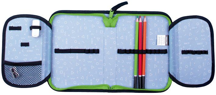 Jednopatrové penály mají velkou kapacitu k umístění psacích potřeb. 24 pevných gumiček různých velikostí slouží k pohodlnému uložení pastelek, psacího pera, tužek, pravítka, ořezávátka a gumy. Nově jsme zvětšili výšku hřbetu penálu, díky čemuž pojme ještě více psacích a jiných potřeb. Chlopně mají na vnější straně průhlednou kapsičku na rozvrh či jiné malé dokumenty, na vnitřní straně je nyní nová síťovaná kapsička pro uložení drobností. Dokonale barevně sladěný design s aktovkou či batohem je samozřejmostí.