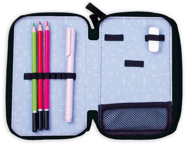Třípatrové penály pojmou nejvíce psacích a školních potřeb. První patro obsahuje 8 gumiček na pastelky, 3 širší gumičky na ořezávátko i gumu a nově i síťovanou kapsičku s pružným lemem na uložení drobností. Ve druhém patře je umístěna průhledná kapsička na rozvrh a 10 pevných gumiček na psací potřeby různých velikostí. Třetí část penálu nabízí navíc ještě dalších 15 gumiček na tužky a 2 další šiřší gumičky pro různé potřeby. Dokonale barevně sladěný design s aktovkou či batohem je samozřejmostí.
