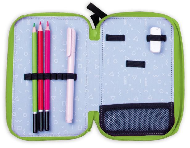 Třípatrové penály pojmou nejvíce psacích a školních potřeb. První patro obsahuje 8 gumiček na pastelky, 3 širší gumičky na ořezávátko i gumu a nově i síťovanou kapsičku s pružným lemem na uložení drobností. Ve druhém patře je umístěna průhledná kapsička na rozvrh a 10 pevných gumiček na psací potřeby různých velikostí. Třetí část penálu nabízí navíc ještě dalších 15 gumiček na tužky a 2 další šiřší gumičky pro různé potřeby. Dokonale barevně sladěný design s aktovkou či batohem je samozřejmostí.