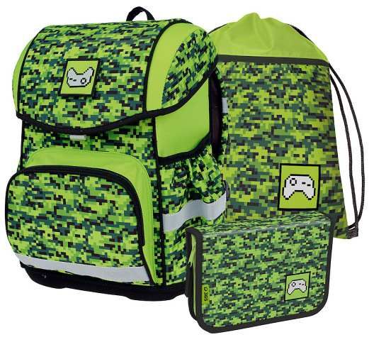 Školní set obsahuje: 1. Školní aktovku – kvalitní, ergonomicky tvarovaná odlehčená školní aktovka je vybavena reflexními prvky a anatomicky tvarovanými zády s pevnou konstrukcí 2. Školní penál jednopatrový, prázdný s dvěma chlopněmi, o rozměru š. 19,5 x v. 4,5 x h. 13,5 cm 3. Školní sáček na tělocvik vyrobený z pevného, kvalitního materiálu. Rozměr sáčku 44 x 32 cm.