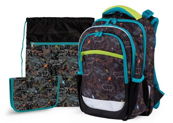Školní set obsahuje: 1. Školní batoh junior - kvalitní, ergonomicky tvarovaný odlehčený školní batoh je vybaven reflexními prvky a anatomicky tvarovanými zády s pevnou konstrukcí. 2. Školní penál jednopatrový, prázdný s dvěma chlopněmi, o rozměru š. 19,5 x v. 3,5 x h. 13 cm. 3. Školní sáček na cvičky vhodný pro žáky 1. stupně ZŠ vyroben z pevného, kvalitního materiálu. Rozměr sáčku na přezůvky 44 x 32 mm. Školní batoh VHODNÝ PRO 1 - 4. třídu. Kvalitní, ergonomicky tvarovaný odlehčený školní batoh je vybaven reflexními prvky a anatomicky tvarovanými zády s pevnou konstrukcí. Školní batohy Stil jsou ověřeny odborníky. Parametry školního batohu: Rozměr: výška 40 cm, šířka 30 cm, hloubka 20 cm. Hmotnost: 0,9 kg. Nosnost: 7 kg. Objem: 20 l. Vlastnosti školního batohu: STIL ADJUSTABLE SYSTÉM: nastavitelný systém zad se třemii stupněmi pro optimální usazení batohu na zádech podle výšky a věku dítěte. Batoh, který roste s dítětem. 3D ZÁDOVÝ SYSTÉM: batoh perfektně sedí na zádech. Anatomický zádový panel se přizpůsobí páteři dítěte a systém Air Flow a prodyšné polstrování umožní cirkulaci vzduchu a příjemné nošení. Hrudní pás s kvalitní přezkou zajistí dobré usazení aktovky na zádech dítěte. BEZPEČNOST: bezpečnostní prvky jsou velmi důležité, proto je aktovka vybavena reflexními pásky na všech stranách batohu, které zaručí lepší viditelnost a bezpečnost dítěte ve tmě. VNITŘNÍ USPOŘÁDÁNÍ: Skládá se ze 3 prostorných komor opatřených pevnými zipy a přední kapsy pro uložení drobných předmětů. Pevná kontrukce a voděodolné dno s plastovými nožičkami. AIR FLOW: prodyšné pohodlně tvarované polstrování zadního panelu. Anatomicky tvarované nastavitelné popruhy pro pohodlné nošení. Hrudní pás pro lepší rozložení váhy školního batohu na zádech. "Pravý skejťák uznává skateboarding jako životní styl, nejen jako sport. Skejťák chce překonat sám sebe a říká si: „Jeď na doraz. Dej tomu všechno. A hlavně si to užij!“".
