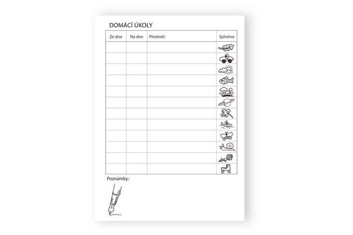 Školní deníček – úkolníček ve formátu A6 s rozvrhem hodin s možností zapisování úkolů a poznámek.