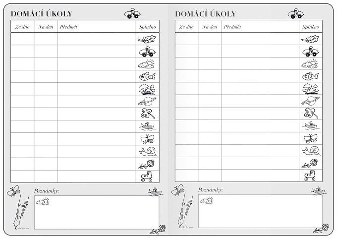 Školní deníček – úkolníček ve formátu A6 s rozvrhem hodin s možností zapisování úkolů a poznámek.