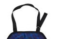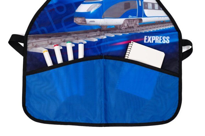 Zástěrka na výtvarnou výchovu se navléká nastavitelným popruhem přes hlavu a zaváže se kolem těla pomocí šňůrek. Je vyrobena z omyvatelného polyesterového materiálu, který se lehce udržuje. Na přední straně jsou 2 kapsy na výtvarné pomůcky. Hlavní část zástěrky je potištěna obrázky ve školních designech, ladících ke školní kolekci.