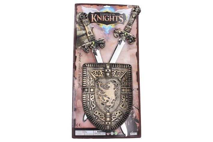 Štít a meče 2ks. Velikost meče 60cm. Velikost štítu: 31x23x0,3cm.