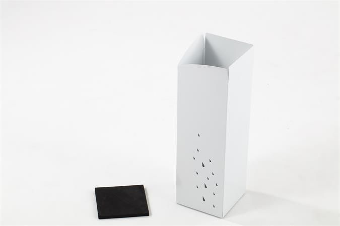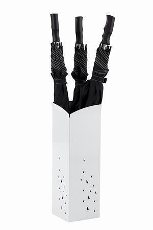 Moderní designový stojan na deštníky pojme až 8 deštníků. Jeho konstrukce nezabírá mnoho místa. Ve spodní části stojanu je umístěna protihluková pěna a na obale (těle) jsou otvory ve formě kapiček, které zajišťují provzdušnění.