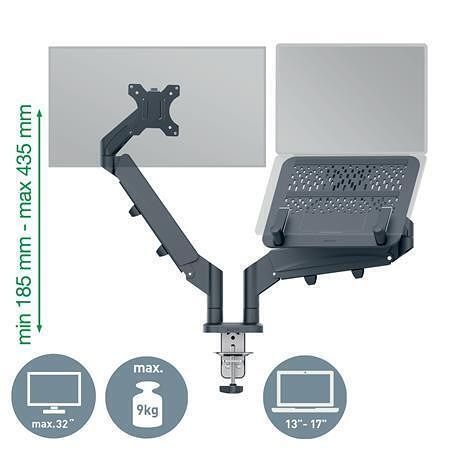 Dvojitá ramena s pružinovou podporou pro snadné nastavení výšky monitoru (185-435 mm) nebo notebooku