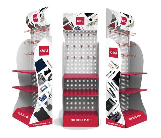 Prezentační stojan na kancelářské potřeby značky Deli- marketingové upoutávky po stranách stojanu a potištěná měkčená deska nahoře jsou odnímatelné- počet polic: 2 (mohou být odstraněny dle potřeby)- počet háků: 40 (bez cedulek na cenu)- rozměr: 200*60*40cm- materiál: kov- dodáváno bez produktů- stojan je dodáván bezplatně na základě smlouvy o zápůjčce