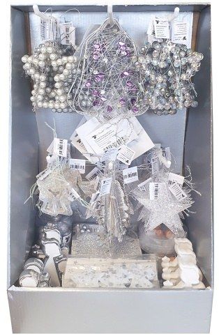 Stojan obsahuje: Kód kartyNázevMnožstvíJednotka3205Stromek nebo hvězda se stříbrnými glitry k zavěšení 7 cm, 6 ks6,000ks3202Bílá hvězda,stromek,anděl se stříbrnými flitry 5 cm, 12 ks6,000ks6729Kuličky stříbrné polystyrénové glitrové cca 2 cm, 30 ks1,000ks70001Anděl 3,5 cm, akryl, 4 ks v krabičce3,000sada3416Keramický anděl 10 cm3,000ks3418Keramický anděl se stříbrnou konturou 10 cm2,000ks3420Keramický andílek se stříbrnou konturou 9 cm2,000ks2710Hvězda k zavěšení 9 cm12,000ks2759Peříčko k zavěšení 10 cm, 2 ks6,000ks2708Hvězda k zavěšení 10 cm, stříbrná6,000ks2717Hvězda plastová závěsná 6 cm, 2 ks6,000ks2716Anděl plastový závěsný 6 cm, 2 ks6,000ks3019Drátěná dekorace stříbrná s kamínky stromek,hvězda, zvonek 15 cm12,000ks1909Srdce kovové závěsné s kamínky 9 cm3,000ks1908Stromek kovový závěsný s kamínky 9 cm3,000ks1907Hvězda kovová závěsná s kamínky 9 cm3,000ks1906Anděl kovový závěsný s kamínky 9 cm3,000ks2715Srdce kovové závěsné s perlami 9 cm3,000ks2714Stromek kovový závěsný s perlami 9 cm3,000ks2713Hvězda kovová závěsná s perlami 9 cm3,000ks2712Anděl kovový závěsný s perlami 9 cm3,000ks