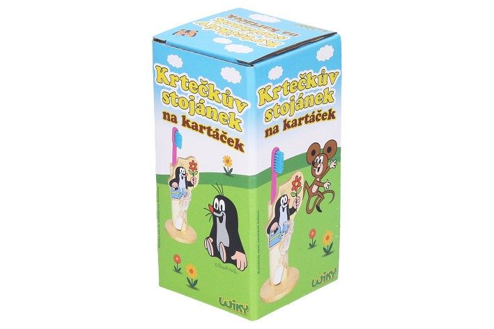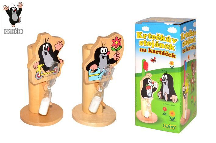 Stojánek na kartáček krtek. Dřevěný. Bez kartáčku. Součástí přesýpací hodiny. Velikost 13 cm. 1 varianta - konvička.