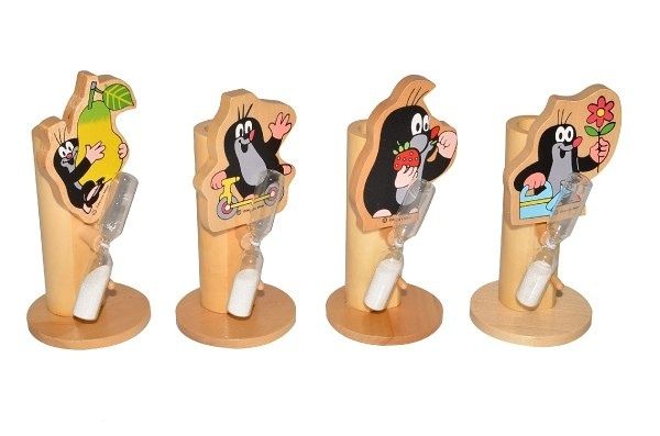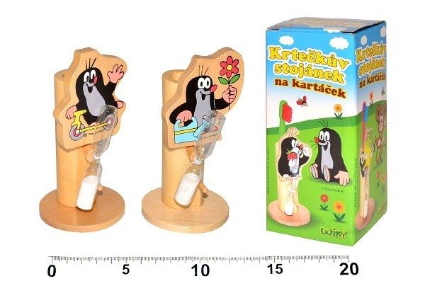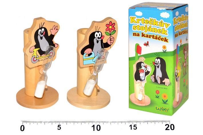Stojánek na kartáček krtek. Dřevěný. Bez kartáčku. Součástí přesýpací hodiny. Velikost 13 cm. 1 varianta - konvička.