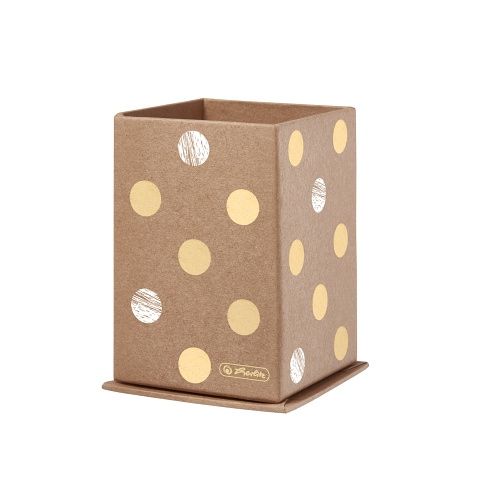 Stojánek na tužky Pure Glam, se vzhledem kraftového papíru s reliéfem zlatých a bílých puntíků, výška: 10 cm, obvod: 6,5 x 6,5 cm