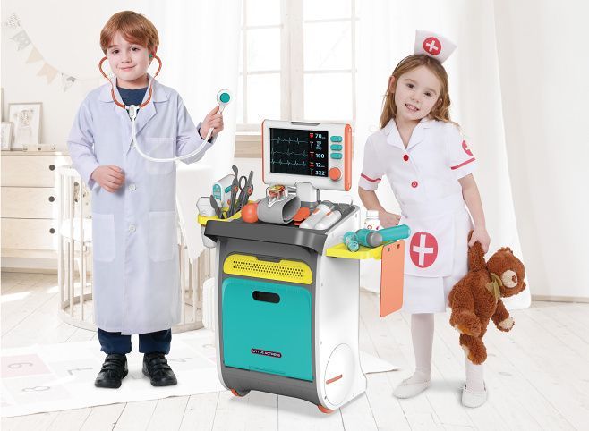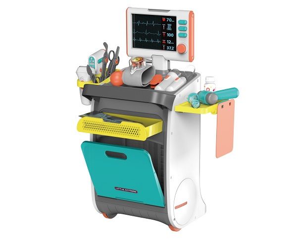 Lékařský stolek s nástroji. Rozměry 85,5 x 43 cm. Výškoměr je možné vysunout z 85,5 cm až na 112 cm, výška stolku bez výškoměru je 60 cm. Obsah balení - podložka, tlakoměr, 6 x rentgenový snímek, kladívko, stříkačka, léky, spona, skalpel, kleště, nůžky, pinzeta, dentální zrcátko (2xAG13/LR44), stetoskop (2xAG13/LR44), teploměr (3xAG13/LR44), ultrazvuk (2xAG13/LR44), světlo (2xAG13/LR44). Všechny baterie typu AG13/LR44 jsou součástí balení. Stolek - 2xAA baterie (nejsou součástí). Nástroje s efekty - dentální zrcátko, stetoskop, teploměr, ultrazvuk, světlo. Monitor vydává zvukové efekty a melodie. Stolek má otevírací šuplík a dvířka.