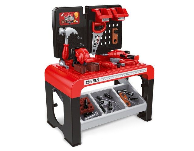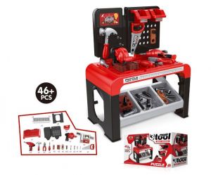 Stolek s nářadím. Rozměry 47x28x57,5 cm. 46 ks nářadí - šrouby, hřebíky, kladivo, šroubovák, kleště, ruční pila, okružní pila. Včetně věšáků a přihrádek na nářadí.