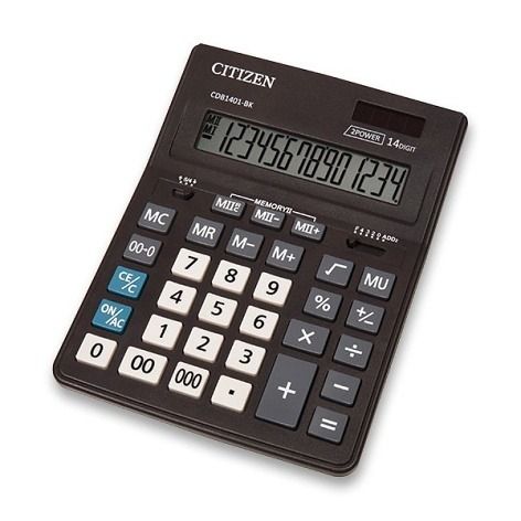 Kompaktní stolní kalkulátor se základními funkcemi a 14místným mírně nakloněným displejem.