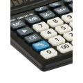 Kompaktní stolní kalkulátor se základními funkcemi a mírně nakloněným displejem.