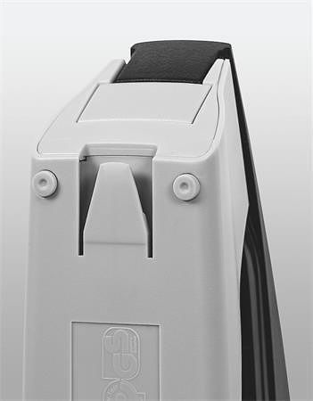Tlačítko pro snadné otočení kovadlinky a změnu typu sešívání - otevřené a uzavřené sešívání, otevřením ramene o 180° je možné i sešívání nástěnkové (takrování)