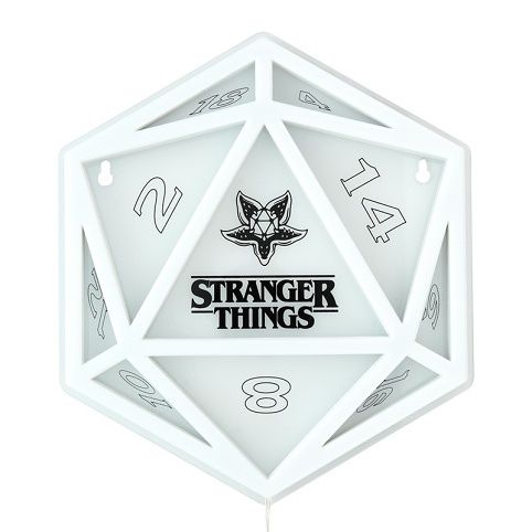 Neonové světlo ve tvaru dvacetistěnu (D20) je inspirované populárním seriálem Stranger Things a je určeno k zavěšení na stěnu. Svítidlo je vyrobeno z plastového rámu, který je na výběr v bílé barvě, s průhlednými panely zdobenými čísly a ikonickým logem Stranger Things uprostřed. Na některých stranách je také zobrazen symbol Demogorgona, což podtrhuje tematické zaměření na svět série. Světlo využívá LED technologii, která zajišťuje jasné a výrazné červené světlo, jež vytváří výraznou neonovou atmosféru. Rozměr světla je přibližně 24 cm na výšku, což z něj činí výrazný dekorativní prvek vhodný do pokojů fanoušků nebo herních koutků. Ovládání je jednoduché díky vypínači umístěnému na USB kabelu, přičemž adaptér pro připojení do zásuvky není součástí balení. Produkt je zabalený v černé krabičce s výrazným logem Stranger Things a obrázkem osvětleného světla na přední straně. Balení obsahuje i informace o možnosti montáže na zeď, což usnadňuje instalaci a využití světla jako stylového doplňku interiéru. Tento licenční výrobek spadá do kategorie merch a dárků pro fanoušky a může být zařazen mezi ostatní hračky a dekorace.