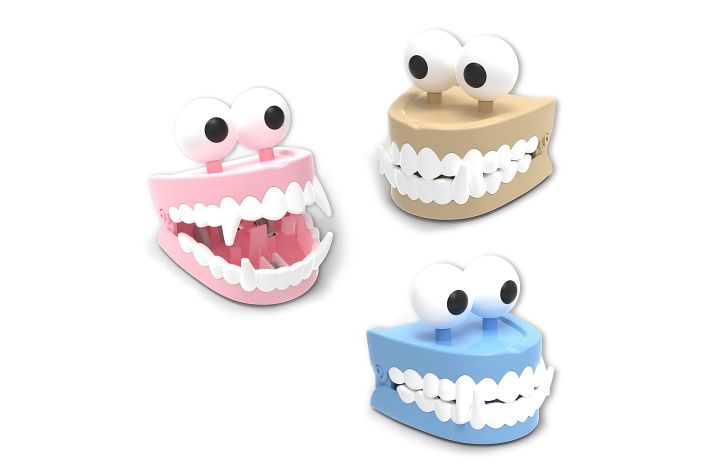Strašidelné zuby na natažení. Rozměry 6,5x7x7 cm. Po natažení zuby jezdí a cvakají. Display box 24 ks. 3 varianty - žlutá, modrá, růžová.