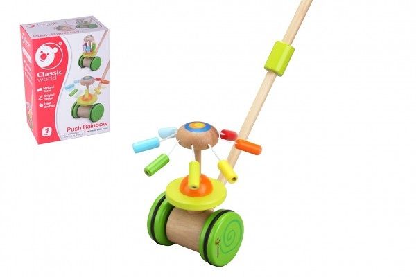 Strkadlo kolotoč tlačící duhový dřevo 50cm na kolečkách s tyčkou v krabici 20x29x14cm 12m+