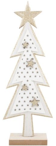 Dekorace na postaveníDřevěnýZimní motivyDřevěný stromek v kombinaci přírodní barvy dřeva s bílou a zlatou. Třpytivý zlatý glitr najdete jak na hvězdě na špici, tak na těch na stromečku a dále po okraji stromku.