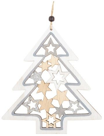 Dekorace na zavěšeníVyřezávané detailyDřevoVánoční dekorace na zavěšení ve tvaru stromku s šedým lemováním a hvězdami. Některé jsou bílé, jiné šedé a na některých z nich najdete stříbrný glitr, který krásně navodí třpyt Vánoc.