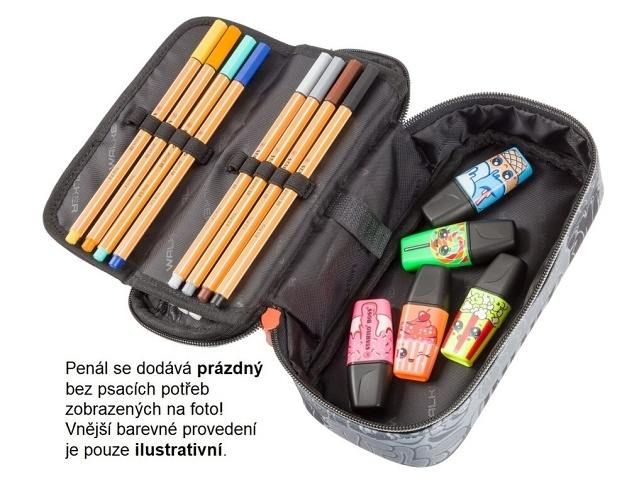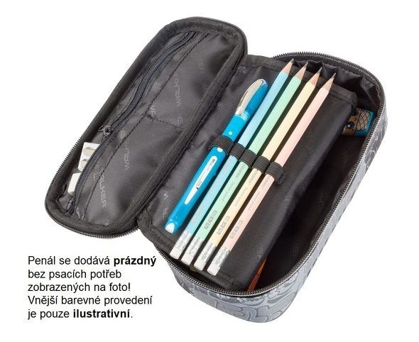 Kvalitní studentský penál WALKER FAME je kombinací penálu, kde můžete ukládat psací potřeby do pruženkových úchytů a boxu, tam je můžete volně uložit. Na vnitřní části horní klopny je našita kapsa na zip. Pod ní jsou pak našity další dvě malé kapsičky. Prostřední klopna je po rozlepení suchého zipu rozevíratelná. Na její horní i spodní straně je našito po deseti pruženkových poutek pro uložení psacích potřeb. Spodní část penálu pak složí jako box.