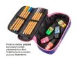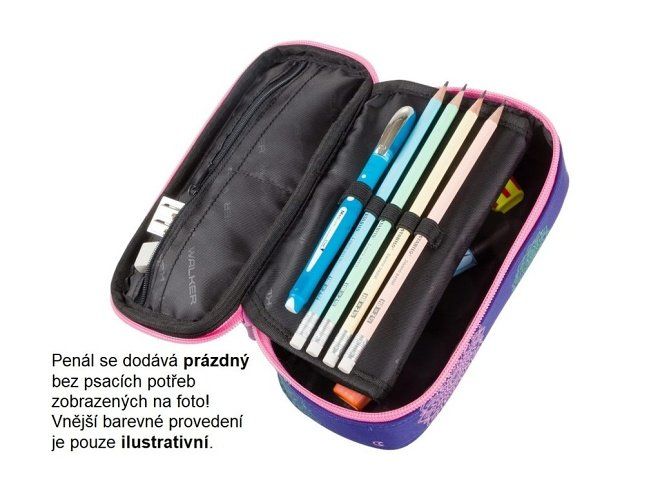 Kvalitní studentský penál WALKER FAME je kombinací penálu, kde můžete ukládat psací potřeby do pruženkových úchytů a boxu, tam je můžete volně uložit. Na vnitřní části horní klopny je našita kapsa na zip. Pod ní jsou pak našity další dvě malé kapsičky. Prostřední klopna je po rozlepení suchého zipu rozevíratelná. Na její horní i spodní straně je našito po deseti pruženkových poutek pro uložení psacích potřeb. Spodní část penálu pak složí jako box.