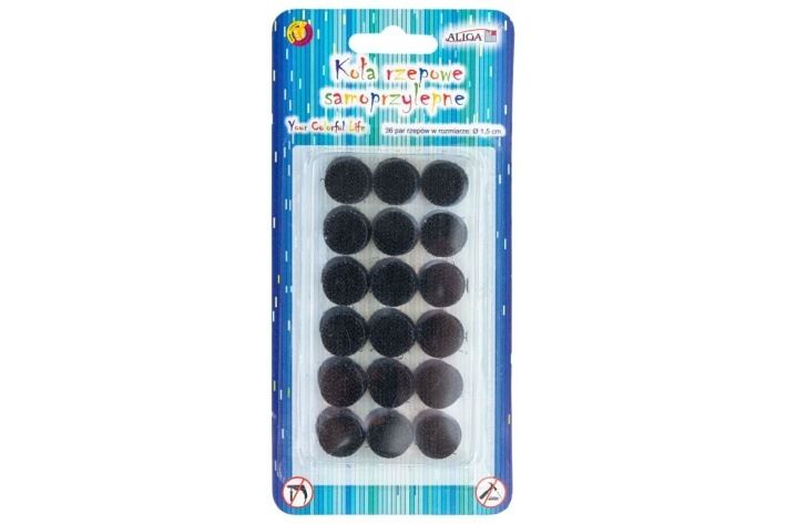 Suché zipy - kolečka o průměru 1,5 cm černé, samolepící. V balení 36 ks suchých zipů.