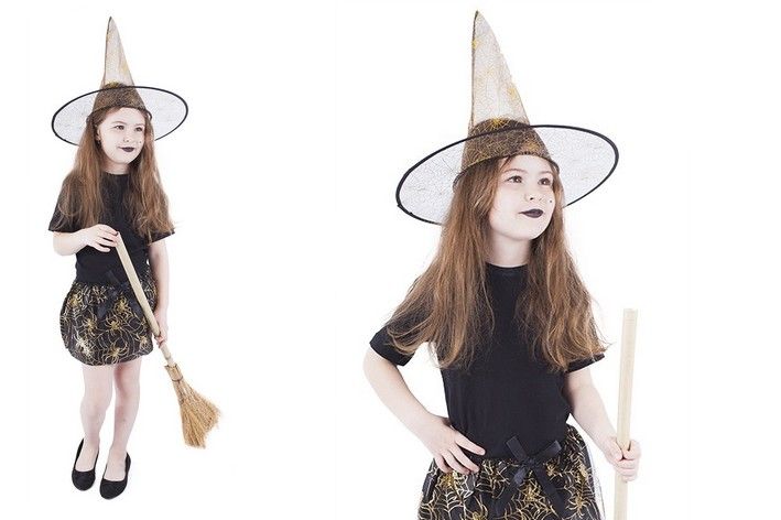 Magická sukýnka pro všechny malé čarodějnice! Kostýmek černé barvy zdobený zlatým dekorem pavučinky je určen pro holčičky ve věkovém rozmezí 3-10 let (104-150 cm).