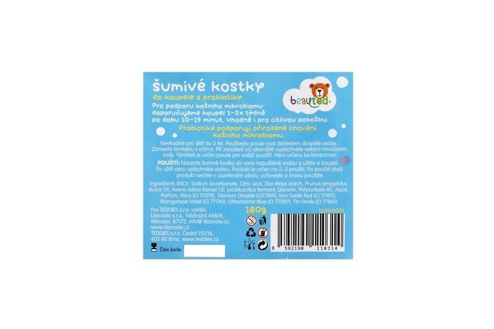 Proměňte koupel v barevné dobrodružství. Šumivé kostky beauted se postarají o zábavu i jemnou péči o dětskou pokožku. Obsahují probiotika podporující přirozenou ochranu pokožky. Obohaceny o minerály z mořské soli, ovesný extrakt a mandlový olej. Dermatologicky testováno – šetrné k dětem. Český výrobek.